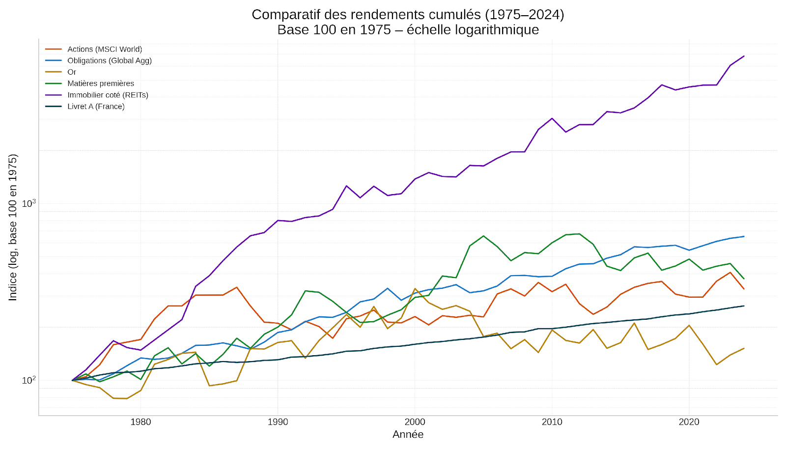 Il y aurait beaucoup à dire de ce graphique pour les différents actifs et à en relativiser l’interprétation selon la courbe des taux. Mais on y constate que l’or… est le placement le moins rentable sur 50 ans. Méfions-nous donc de cette année 2025 qui voit le prix de l’or gonfler bien trop vite.